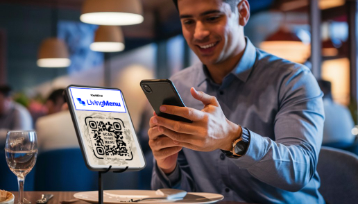 Customers scan QR codes to access the LivingMenu web app, where they can order, track bills, and pay seamlessly for a streamlined dining experience.